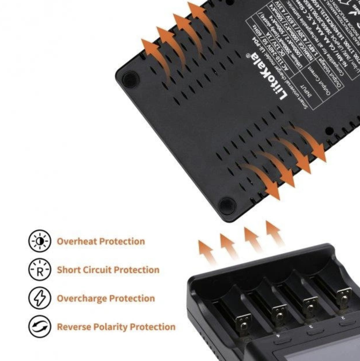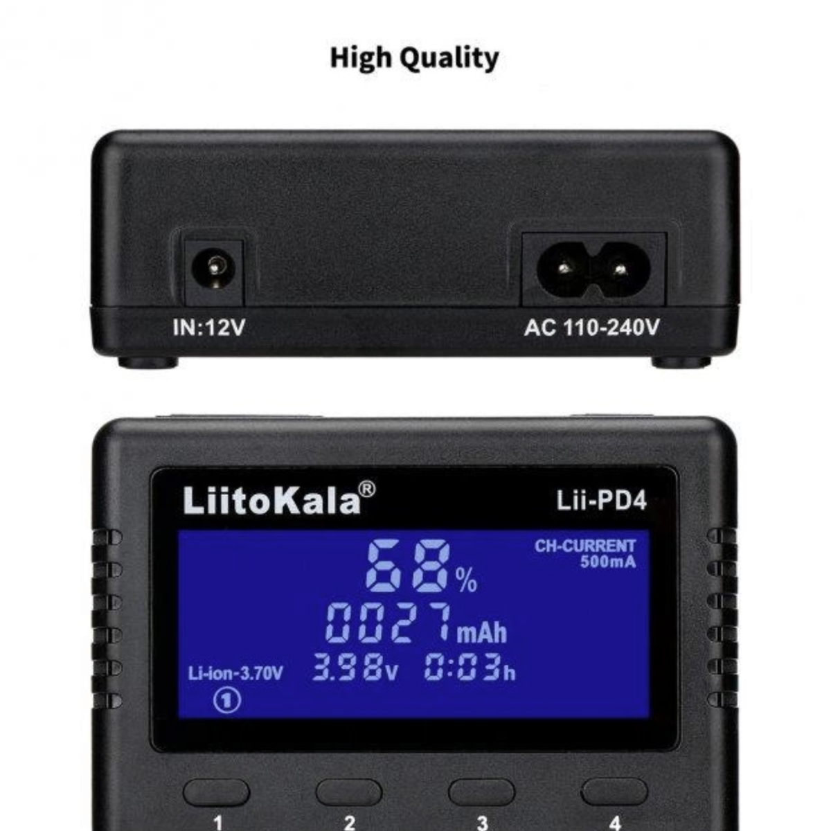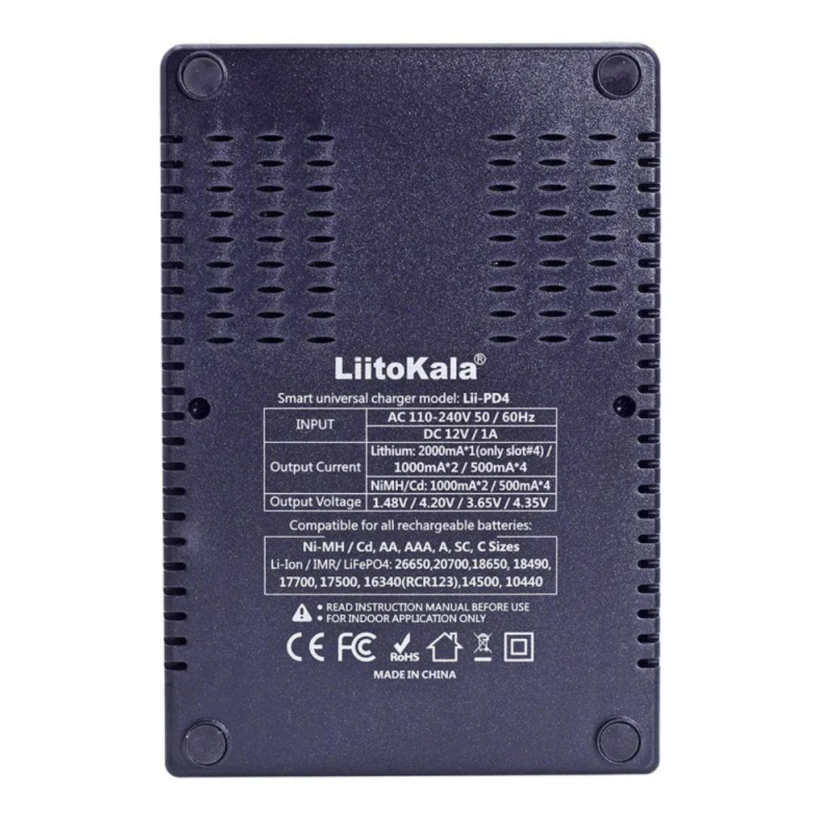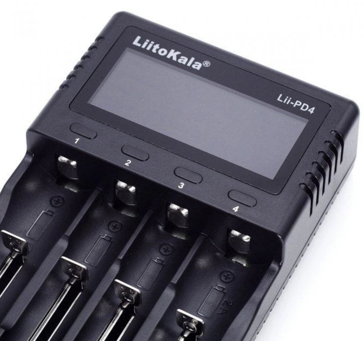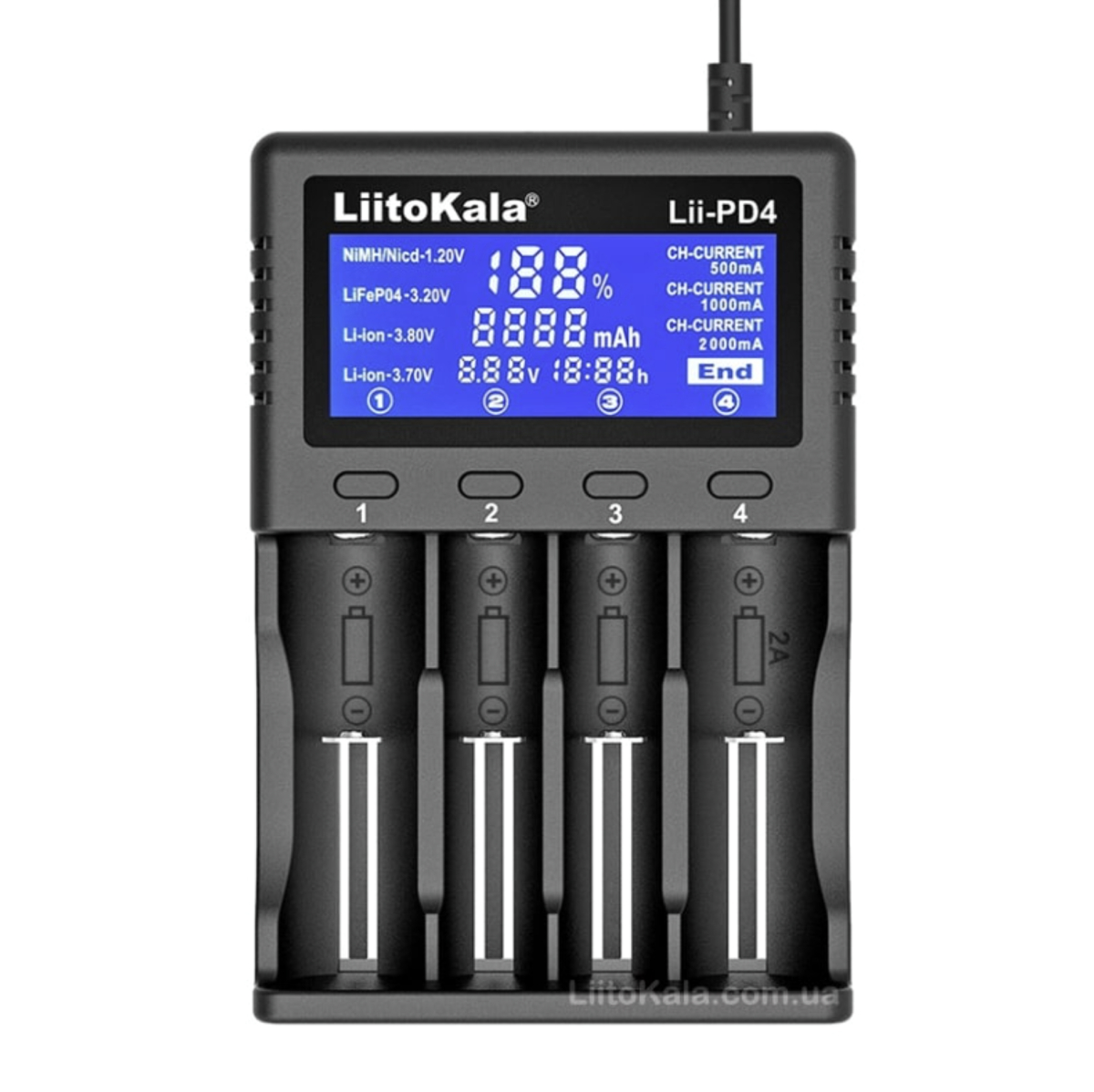 Універсальний заряд LitoKala Liii-PD4 – даний зарядний пристрій універсальний, має 4 каналу для зарядки всіх типів акумуляторів з можливістю вибору. Зручний і великий LCD дисплей допоможе вам правильно вибрати потрібну програму для зарядки. Має функції вимірювання ємності та активації розряджених акумуляторів. Це зарядний пристрій може заряджати всі циліндричні акумулятори 3,7 В Li-Ion, 3,8 В IMR, 1,2 В Ni-MH/Cd, 3,2 В LiFePO4.