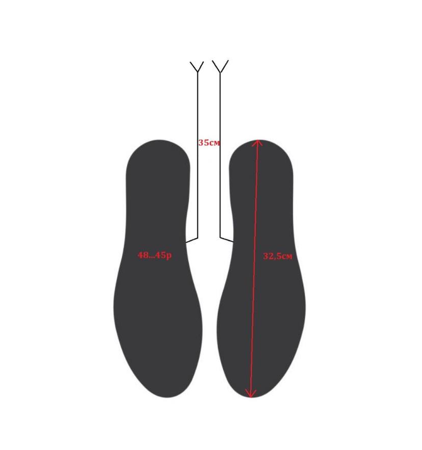 - Матеріал устілки EVA, нижній шар щільністю 100 шор ізолює холод від підошви, верхній шар щільністю 80 шор розподіляє тепло від нагрівального елемента.